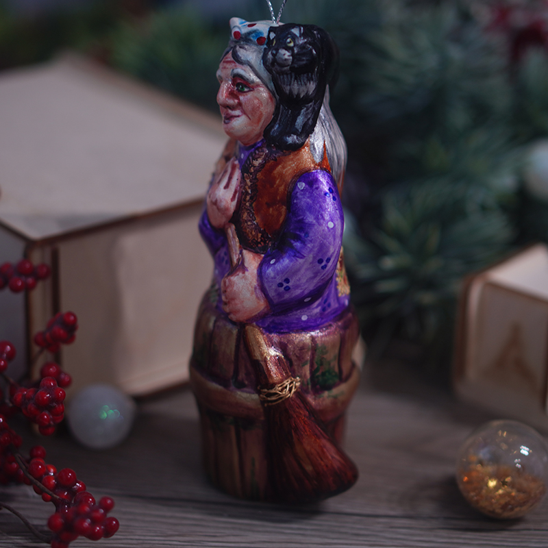Игрушка выполнена из высококачественного фарфора и расписана вручную, благодаря чему каждая деталь — от выразительного лица Бабы Яги до пушистой шерсти кота — выглядит живо и реалистично. Тёплые цвета и авторский дизайн создают ощущение уюта и сказочного очарования.