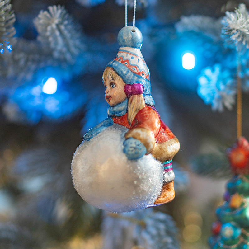Эта ёлочная игрушка воспринимается как маленькая история — о зимних прогулках, снежных играх и простых моментах счастья. Она органично дополняет семейный новогодний декор и коллекции с сюжетными сценами.