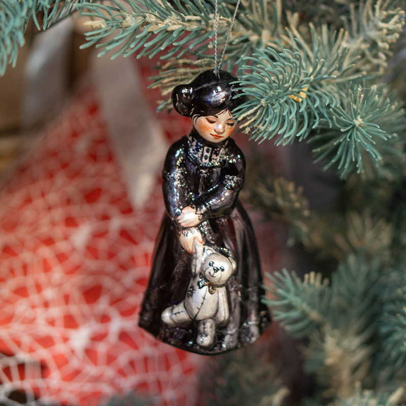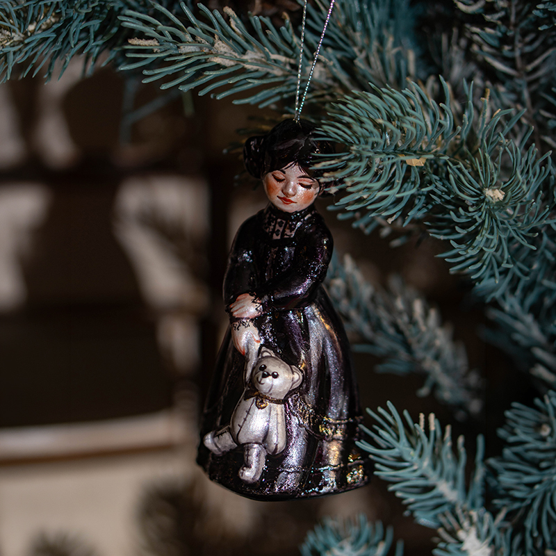 Фарфоровая ёлочная игрушка «Девочка с маленьким мишкой» (готическая версия) — это авторское новогоднее украшение ручной работы из коллекции Christmas Art. Игрушка изображает девочку с маленьким мишкой в руках и выполнена в готическом стиле с чёрным платьем, создавая выразительный, немного загадочный и при этом сказочный образ.