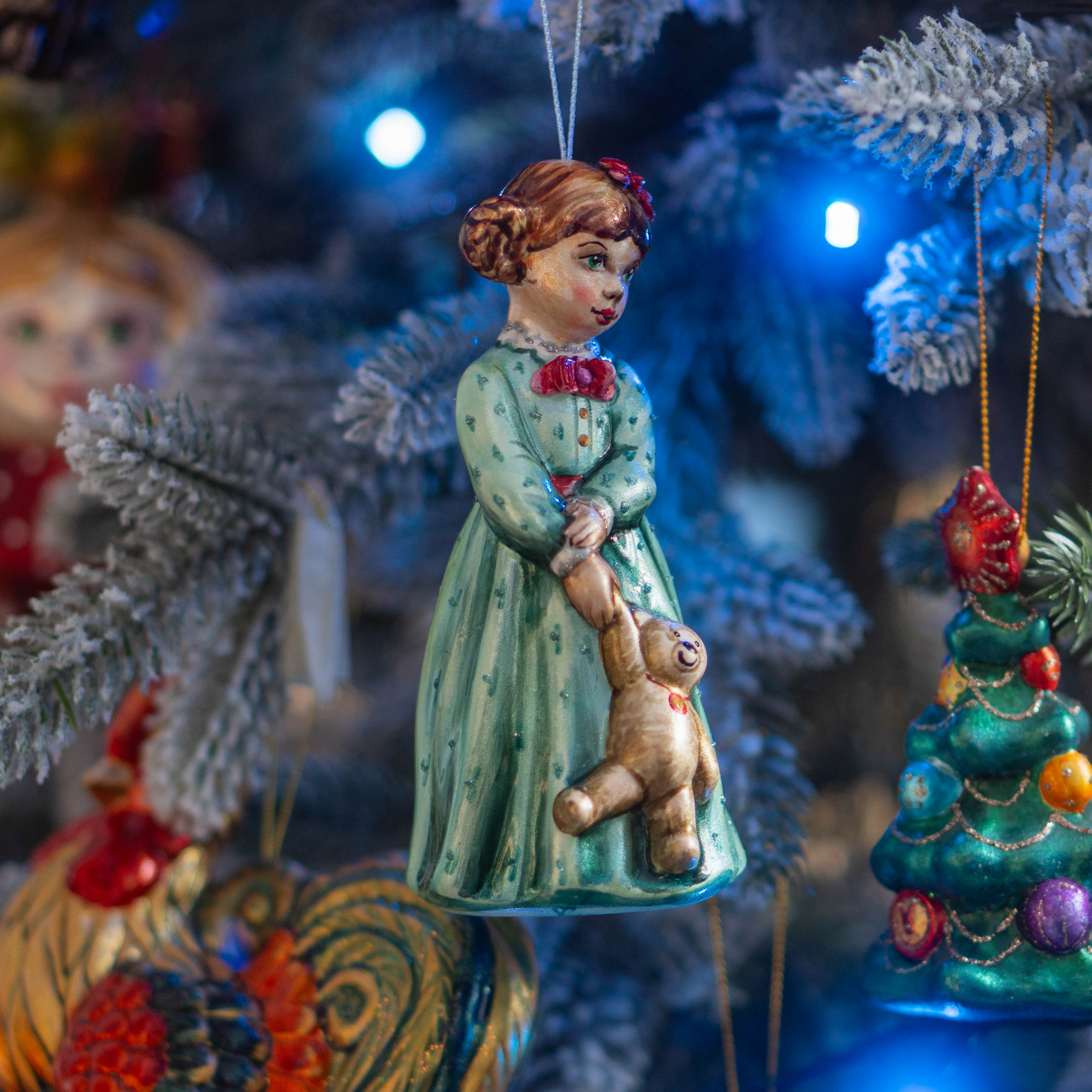 Фарфоровая ёлочная игрушка «Девочка с маленьким мишкой» — это камерный сюжет о привязанности и тихом детском мире. Персонаж изображён в моменте покоя: девочка бережно держит небольшого мишку, словно это её самый важный спутник.