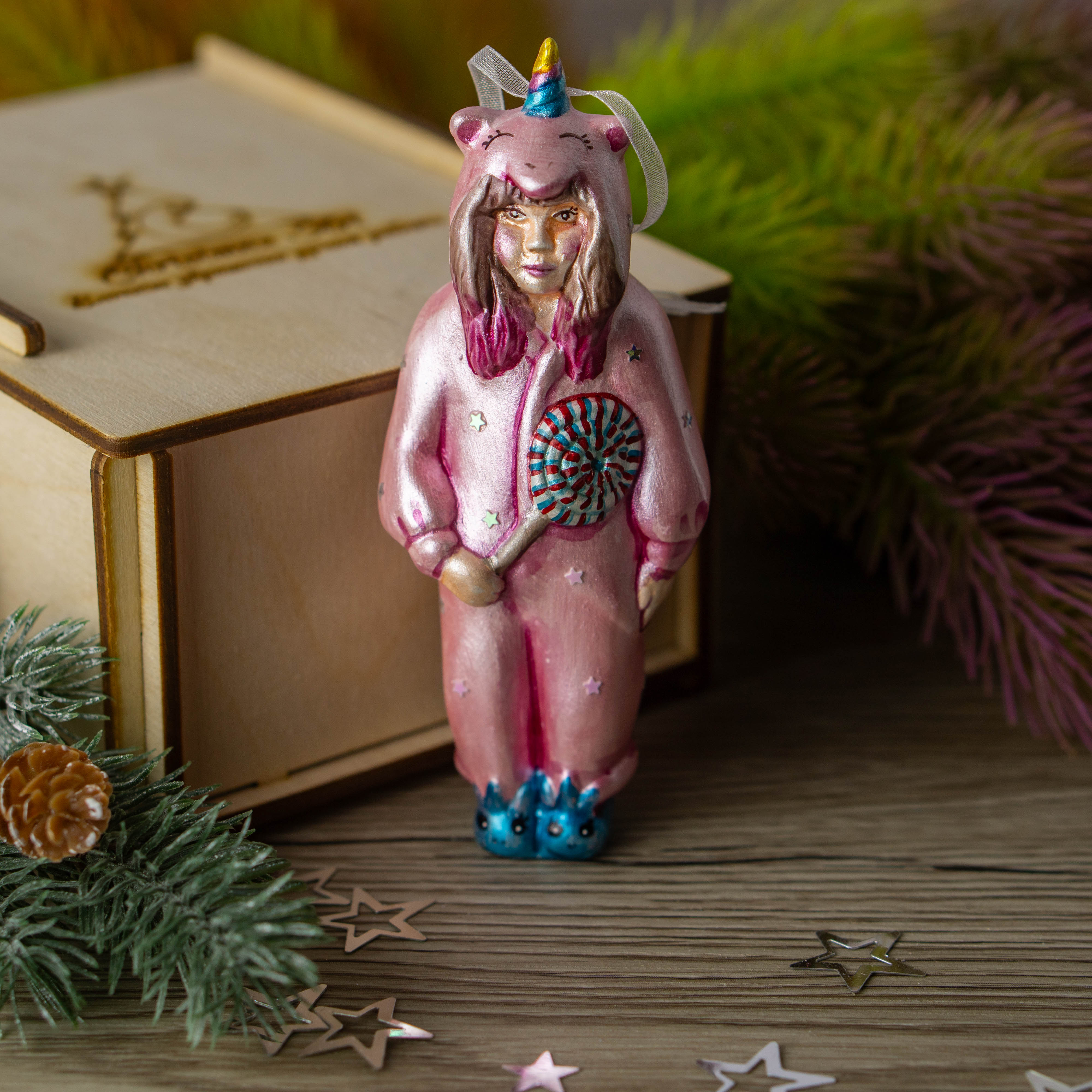Фарфоровая новогодняя игрушка «Девочка в кигуруми единорога Розочка» станет оригинальным подарком на Новый год для детей, родителей и всех, кто ценит милые и необычные ёлочные украшения. Она идеально подходит для оформления детской ёлки, семейных интерьеров и тематических новогодних композиций.