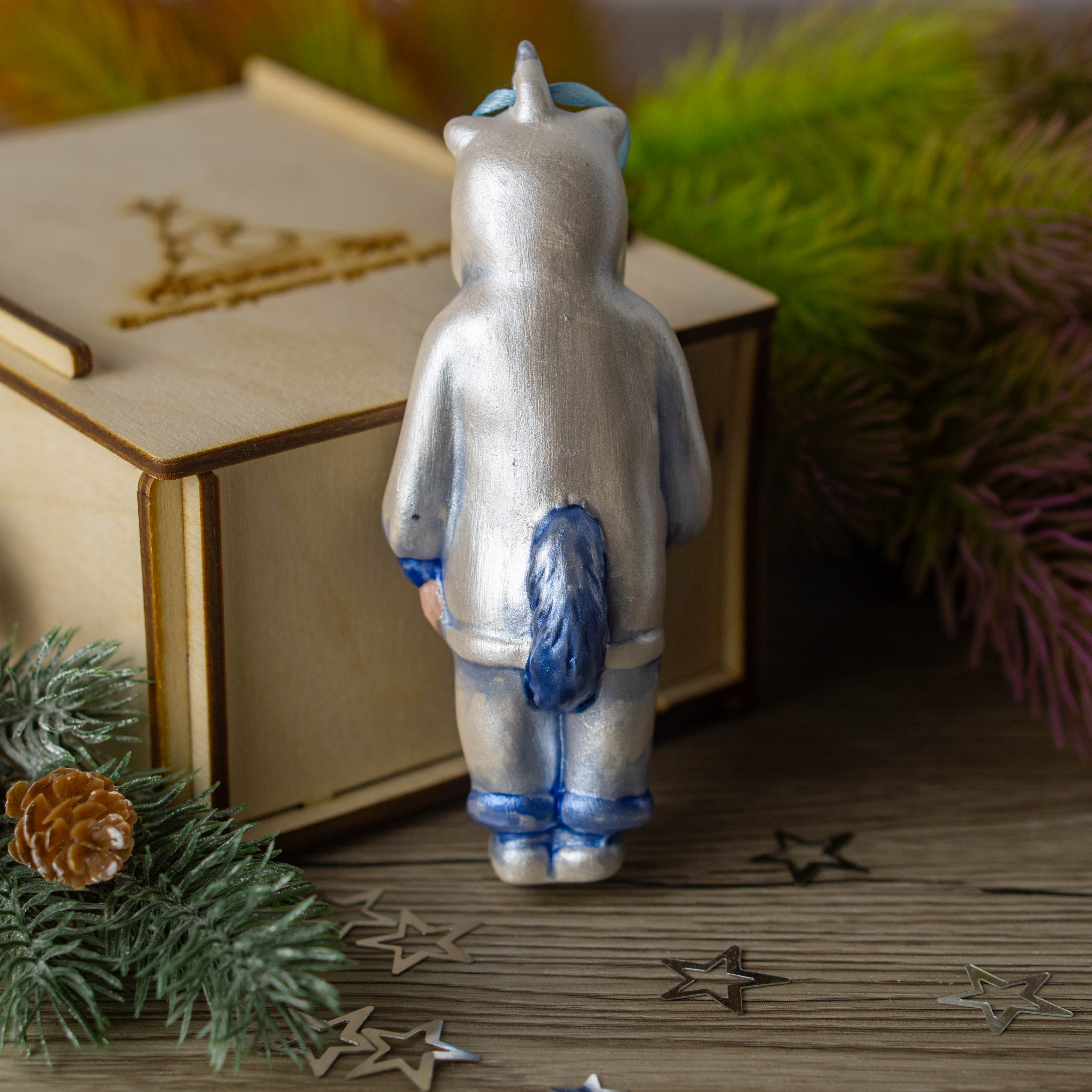 Милый персонаж, плавные формы и аккуратная художественная роспись делают эту ёлочную игрушку особенно выразительной в новогоднем декоре. Детали костюма-единорога придают образу игривость и фантазийность, а глянцевая фарфоровая поверхность красиво отражает свет гирлянд, добавляя мягкое праздничное сияние.