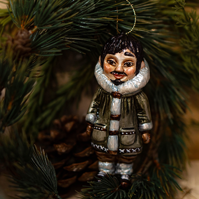 Фарфоровая ёлочная игрушка «Эскимос» — это авторское новогоднее украшение ручной работы из коллекции «Национальные костюмы» мастерской Christmas Art. Игрушка изображает эскимоса в традиционном северном образе и передаёт атмосферу суровой, но завораживающей культуры Севера.