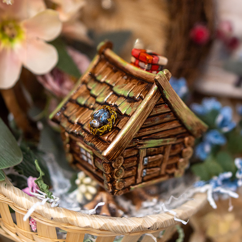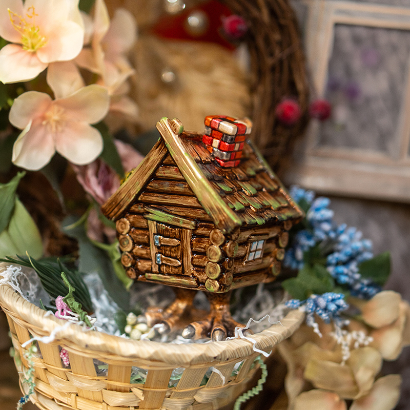 Композиция построена вокруг архитектуры: фактура дерева, форма крыши и выразительные детали создают ощущение настоящей сказочной избушки. Благодаря этому игрушка воспринимается не как персонаж, а как самостоятельный объект с собственной историей и настроением.