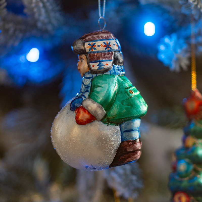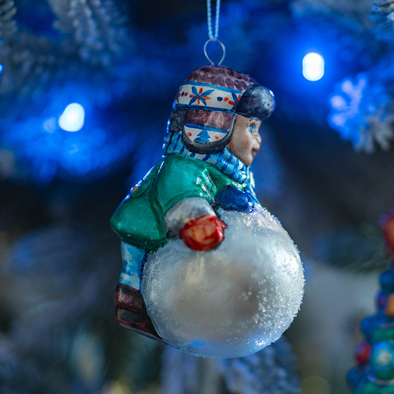Фарфоровая ёлочная игрушка «Мальчик лепит снеговика» — это авторское новогоднее украшение ручной работы, передающее тёплый момент зимнего детства. Сюжет изображает мальчика, увлечённо создающего снеговика, и наполнен ощущением игры, радости и настоящей зимней сказки.