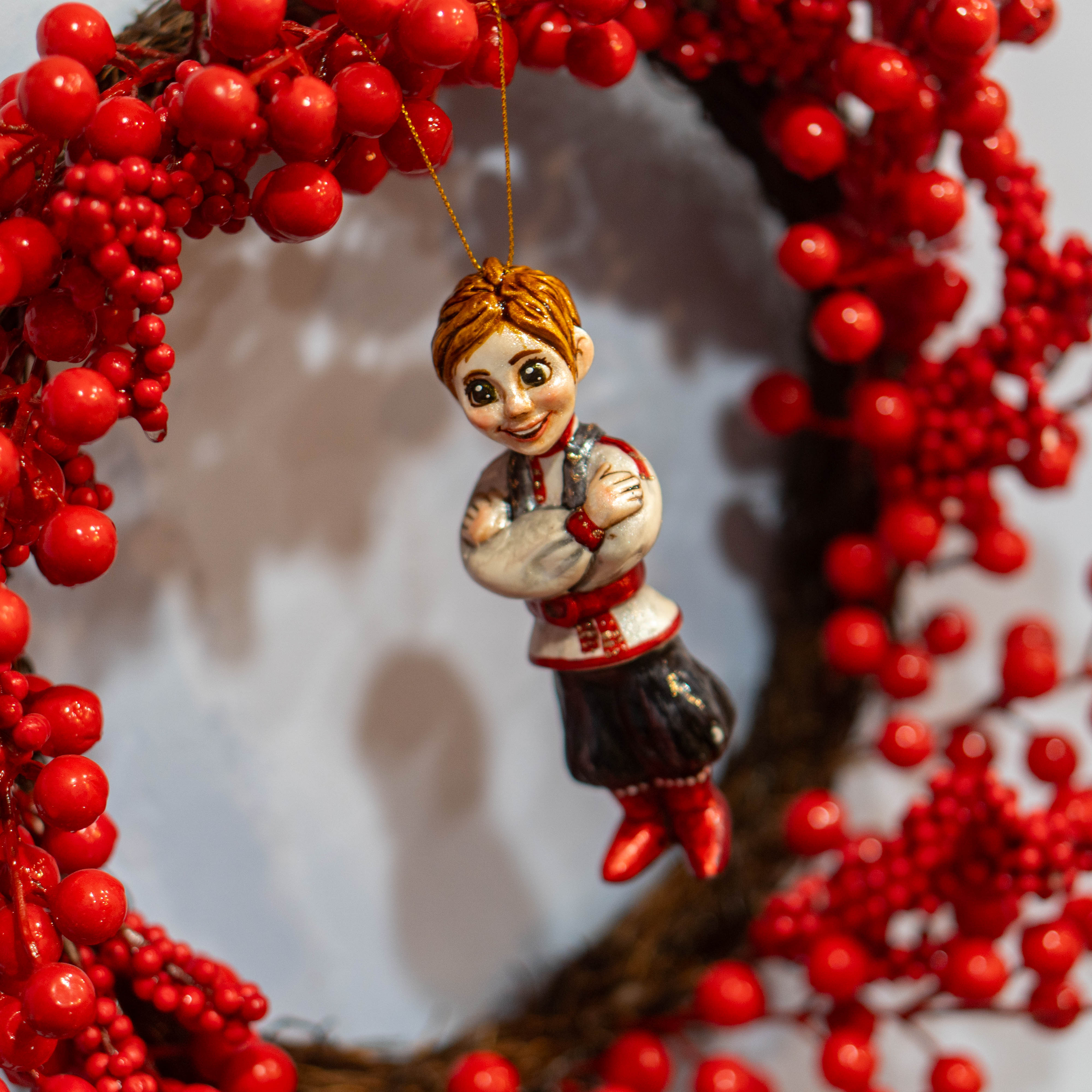 Фарфоровая ёлочная игрушка «Мальчик в национальном русском костюме» — это авторское новогоднее украшение ручной работы, передающее образ ребёнка в традиционной русской одежде. Композиция строится вокруг костюма, который задаёт характер всей фигуры и делает её узнаваемой.