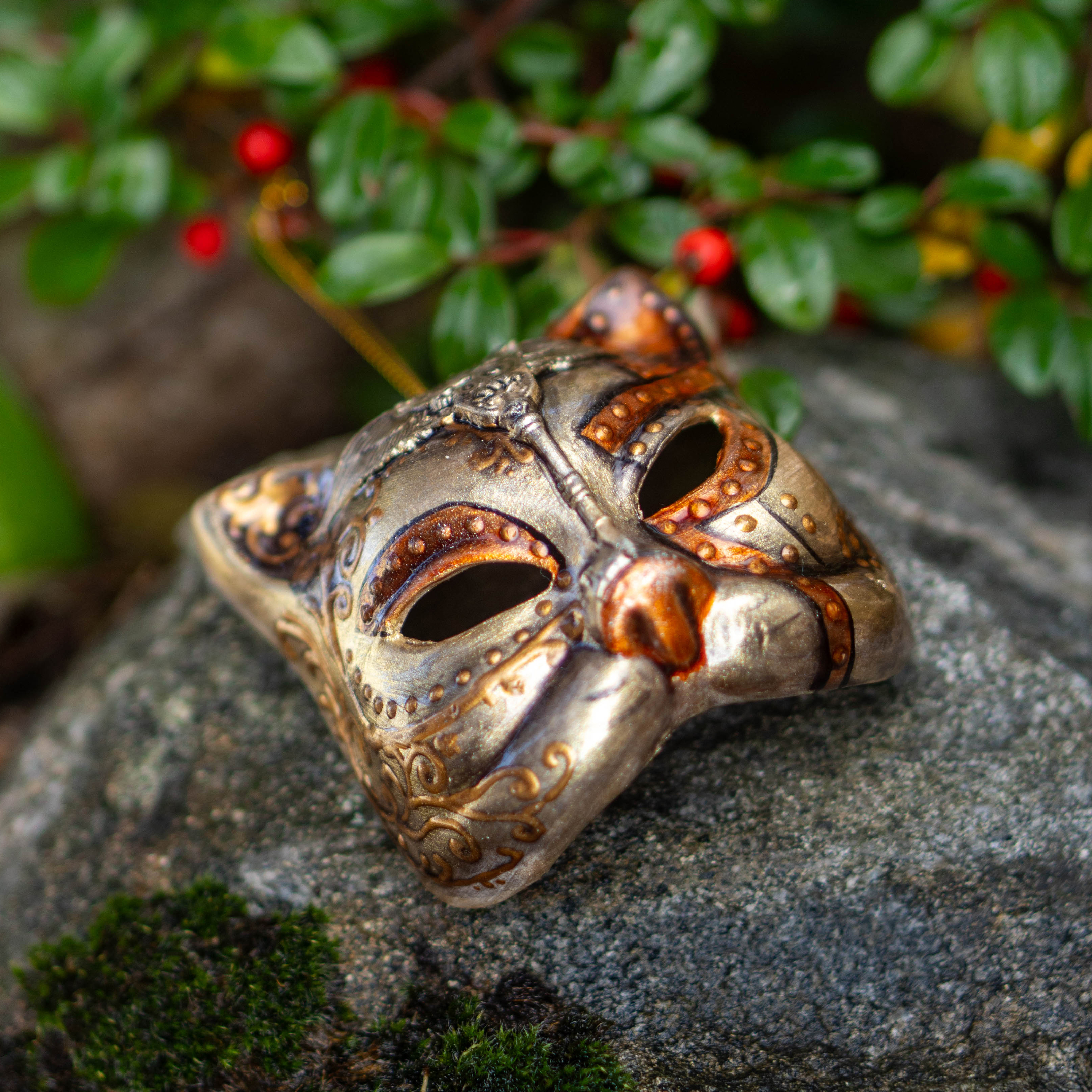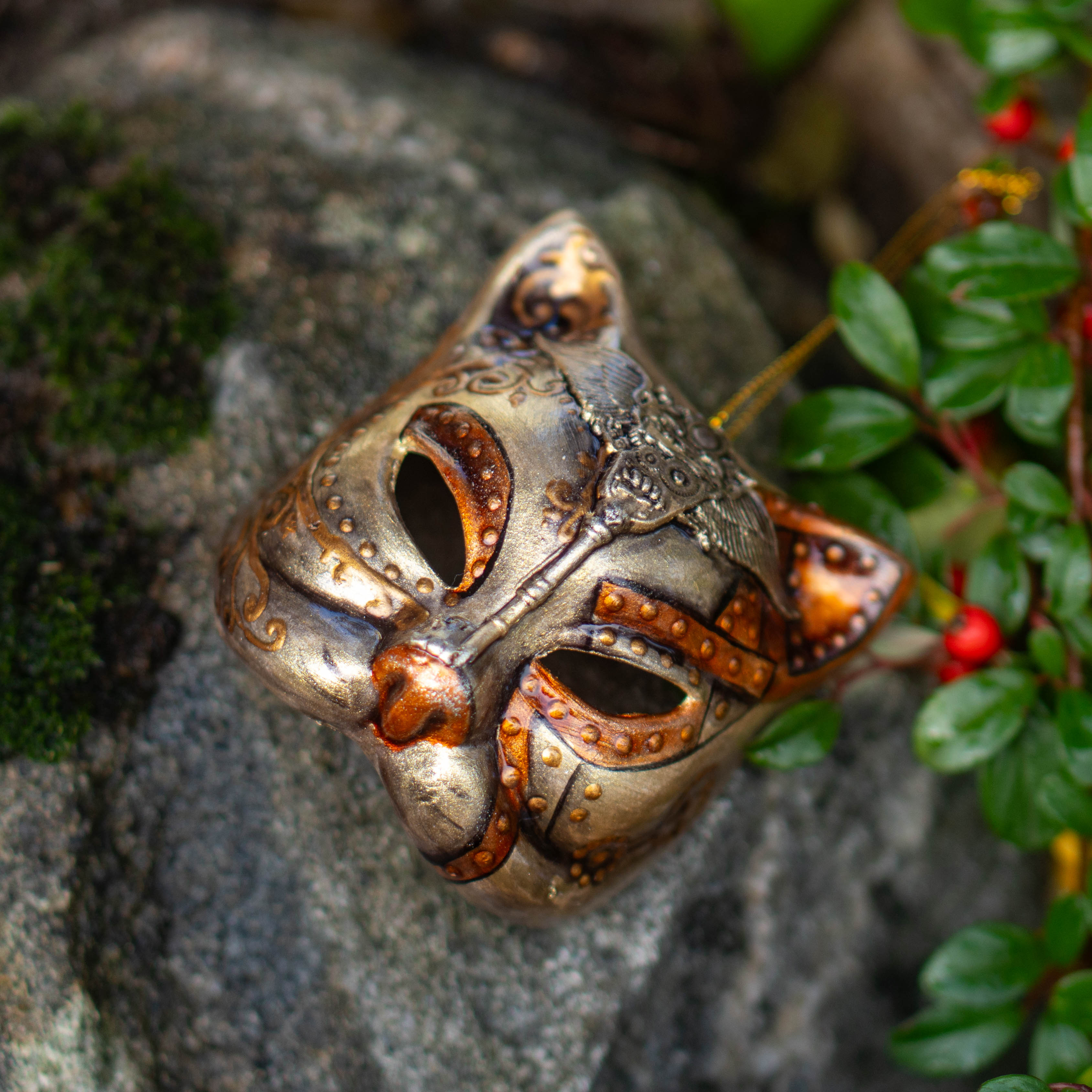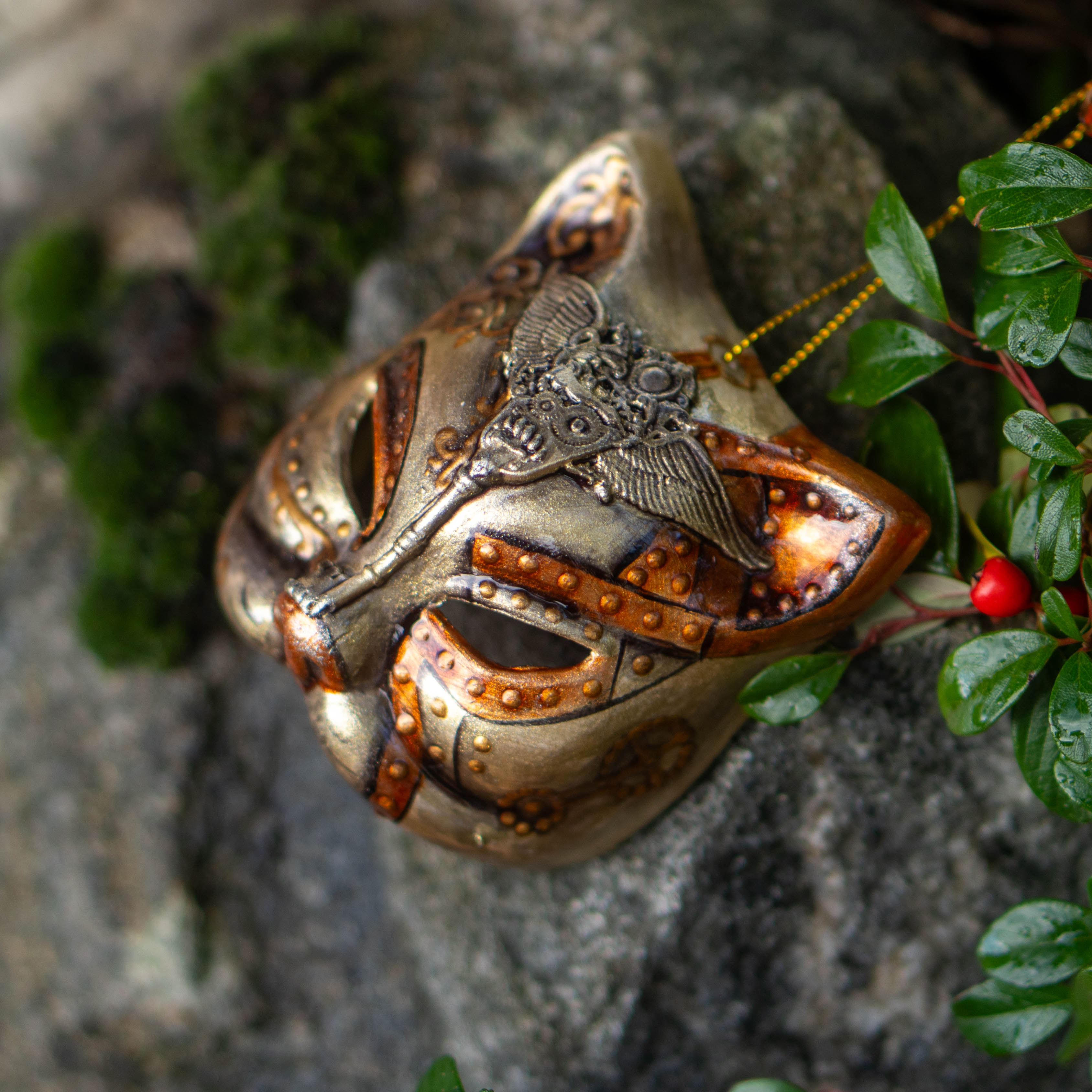Фарфоровая ёлочная игрушка «Маска кота “Стимпанк”» — это авторское украшение ручной работы, в котором образ кота соединён с эстетикой индустриальной фантазии. Маска приобретает характер механического артефакта: декоративные элементы напоминают шестерёнки, конструкции и детали вымышленного механизма.