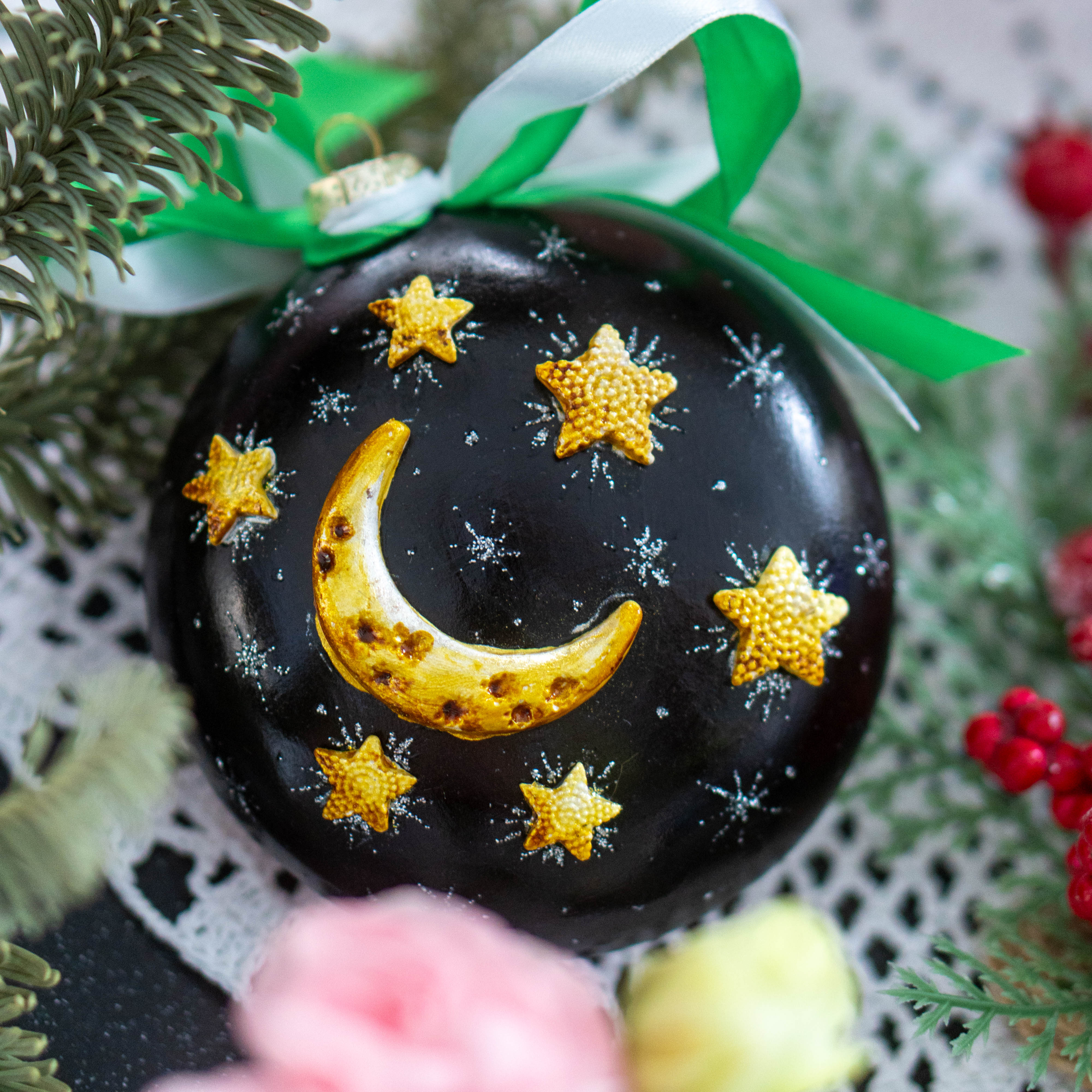 Фарфор усиливает эффект цвета — поверхность делает оттенки более глубокими и живыми. При освещении украшение приобретает мягкое внутреннее сияние, которое подчёркивает форму и рисунок.