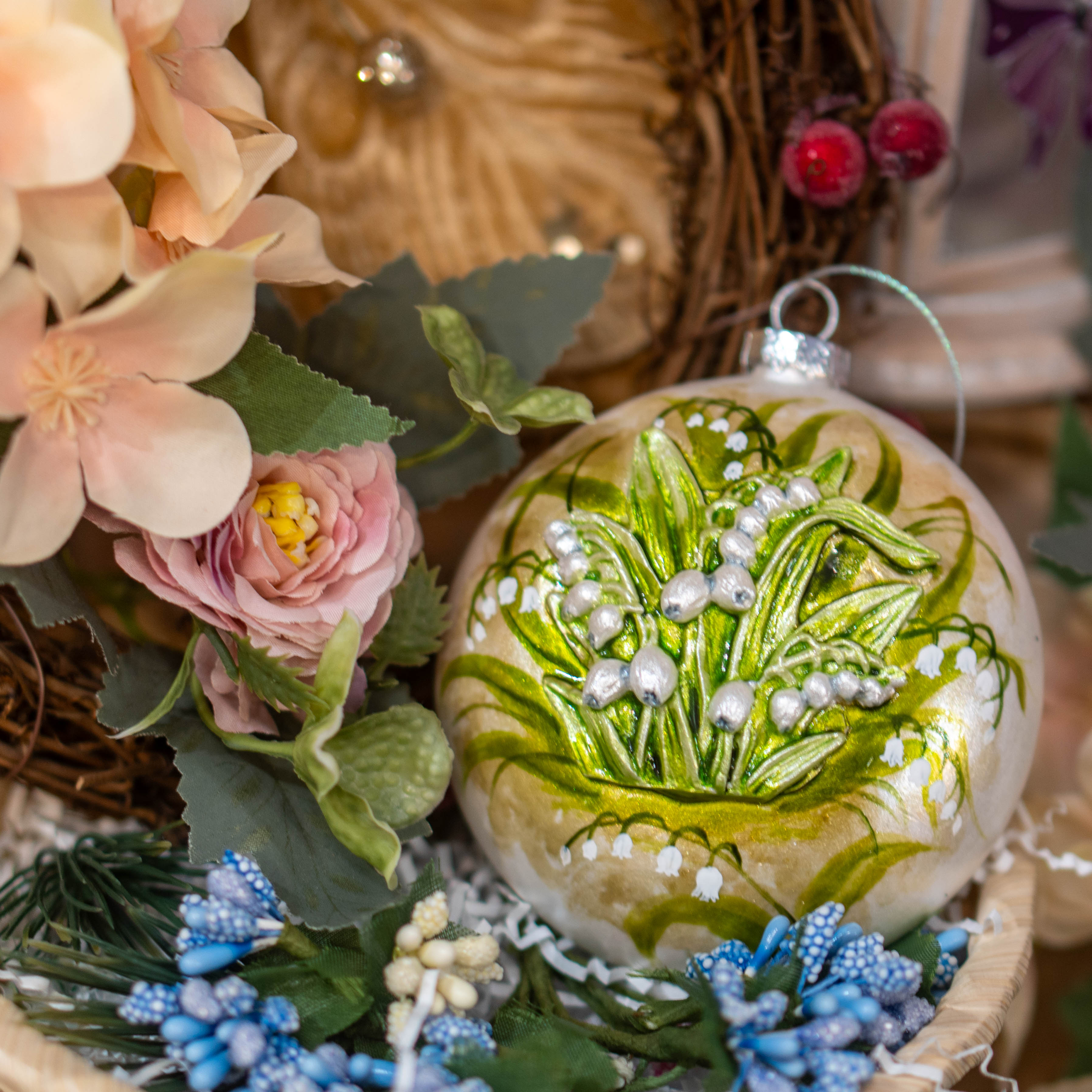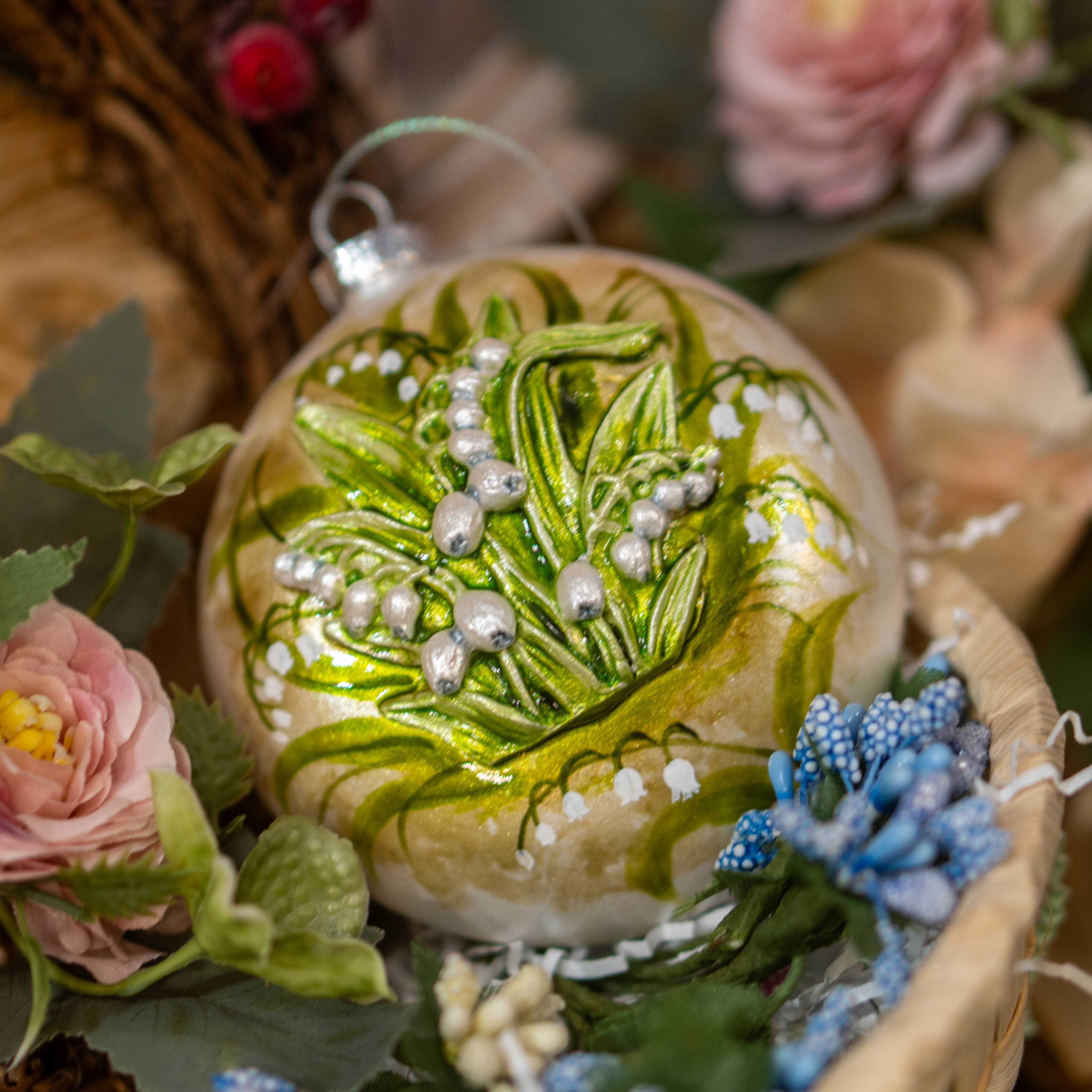 Фарфоровая ёлочная игрушка «Медальон с ландышами» — это авторское украшение ручной работы с деликатным цветочным мотивом. Композиция построена вокруг ландышей — символа чистоты, лёгкости и весеннего обновления.