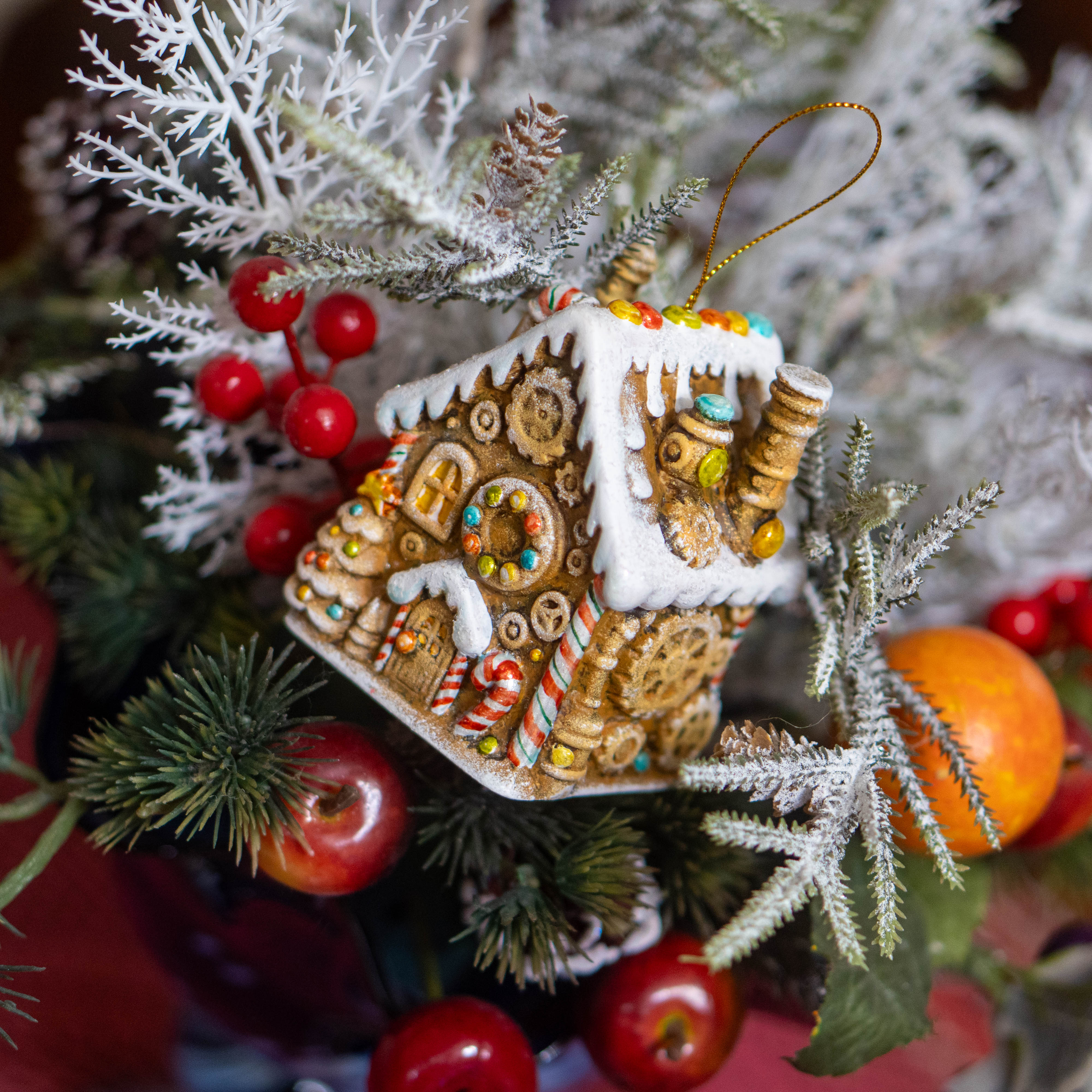 Фарфоровая ёлочная игрушка «Пряничный домик стимпанк» — это авторское новогоднее украшение ручной работы, в котором классический образ праздничного домика переосмыслен через эстетику стимпанка. Знакомая форма пряничного дома здесь приобретает индустриальные черты: декоративные элементы напоминают механизмы, а общий силуэт выглядит необычно и современно.
