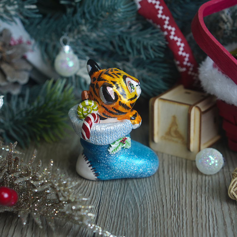 Каждый экземпляр создаётся вручную из прочного фарфора и расписывается художниками Christmas Art, благодаря чему игрушка приобретает индивидуальность и особый шарм. Мастера с любовью прорабатывают каждую деталь — от выразительных глаз тигрёнка до ярких узоров на носке.
