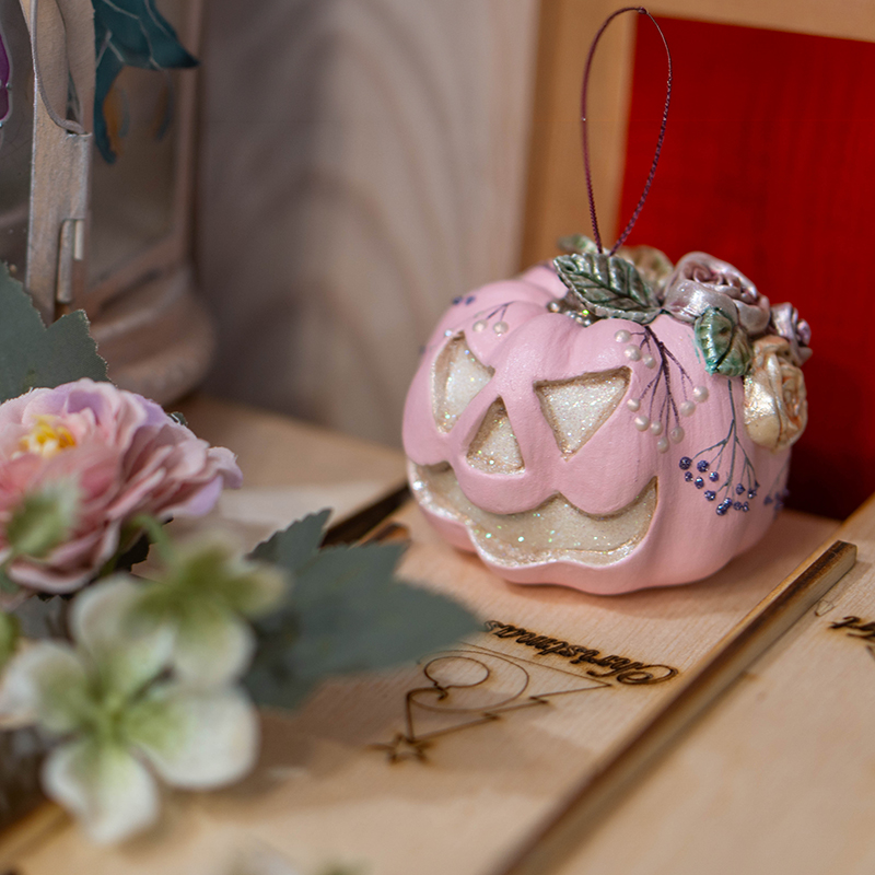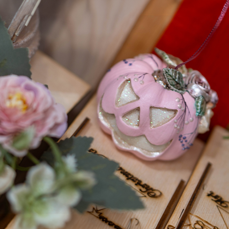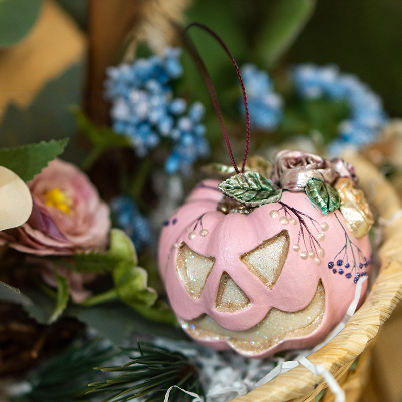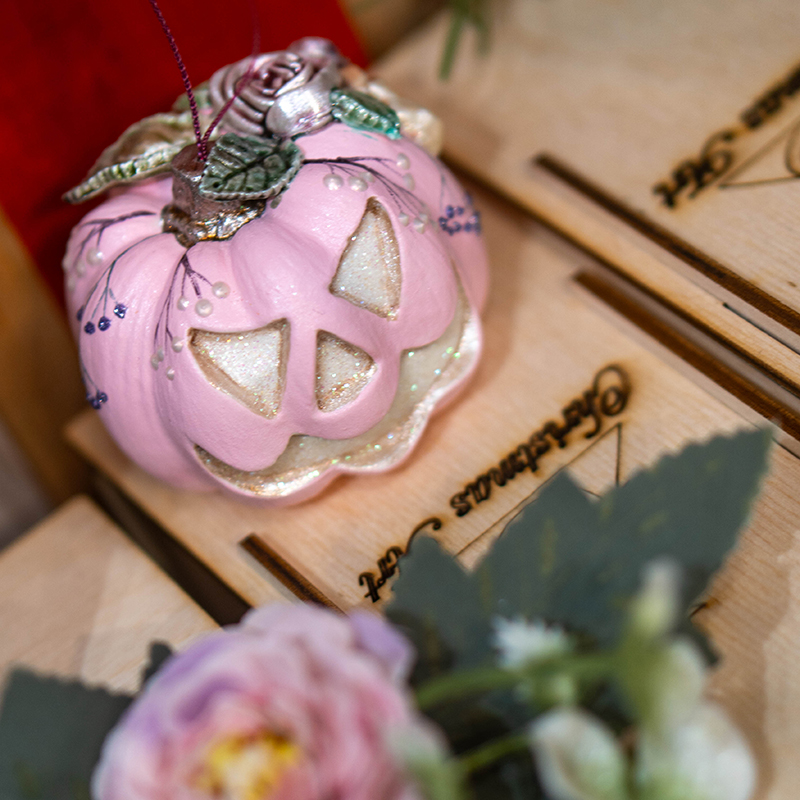 Форма тыквы сохранена узнаваемой, но роспись и детали выполнены деликатно: линии сглажены, выражение «лица» становится более дружелюбным, а общий образ — гармоничным и декоративным. Такая интерпретация делает игрушку универсальной и подходящей не только для Хэллоуина, но и для сезонных осенних композиций.