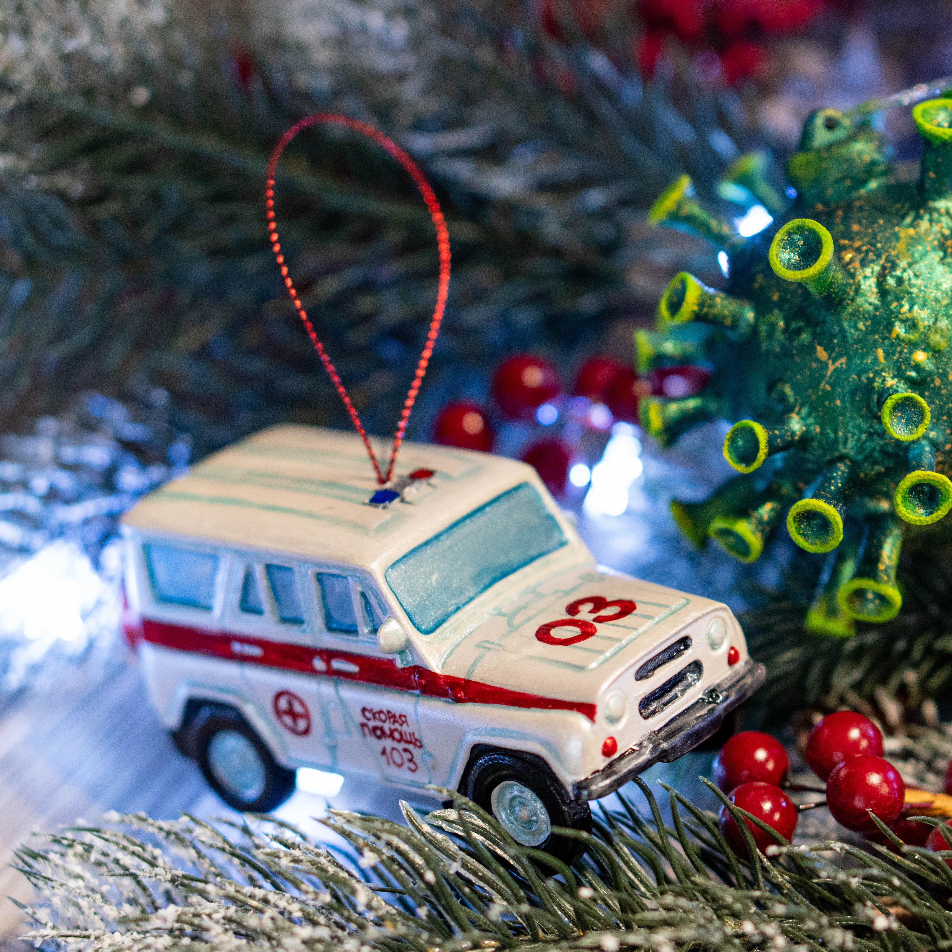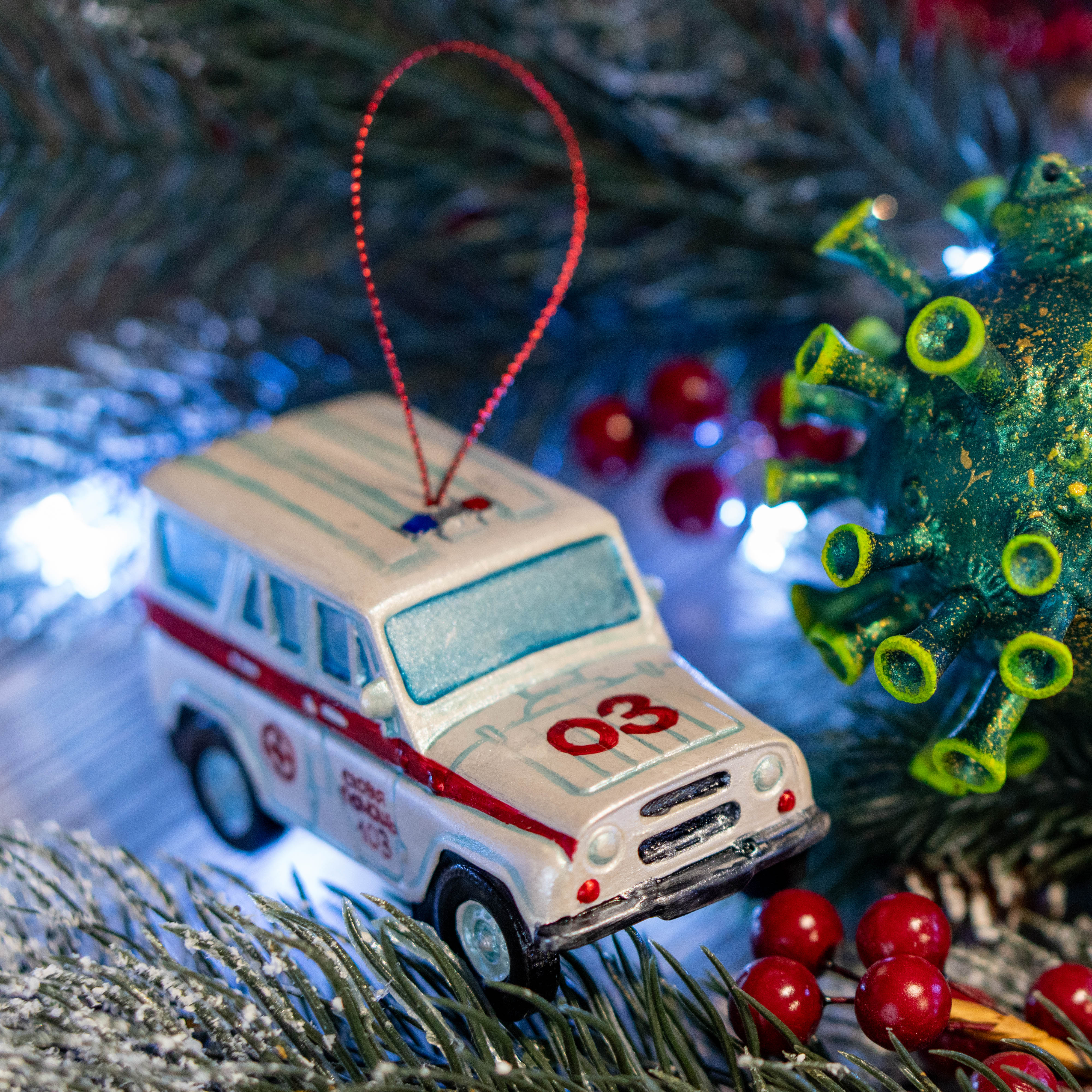 Фарфоровая ёлочная игрушка «Внедорожник скорая помощь» — это авторское новогоднее украшение ручной работы, передающее образ специализированного автомобиля, предназначенного для работы в сложных условиях. Композиция объединяет тему медицины и проходимой техники, создавая необычный и запоминающийся сюжет.