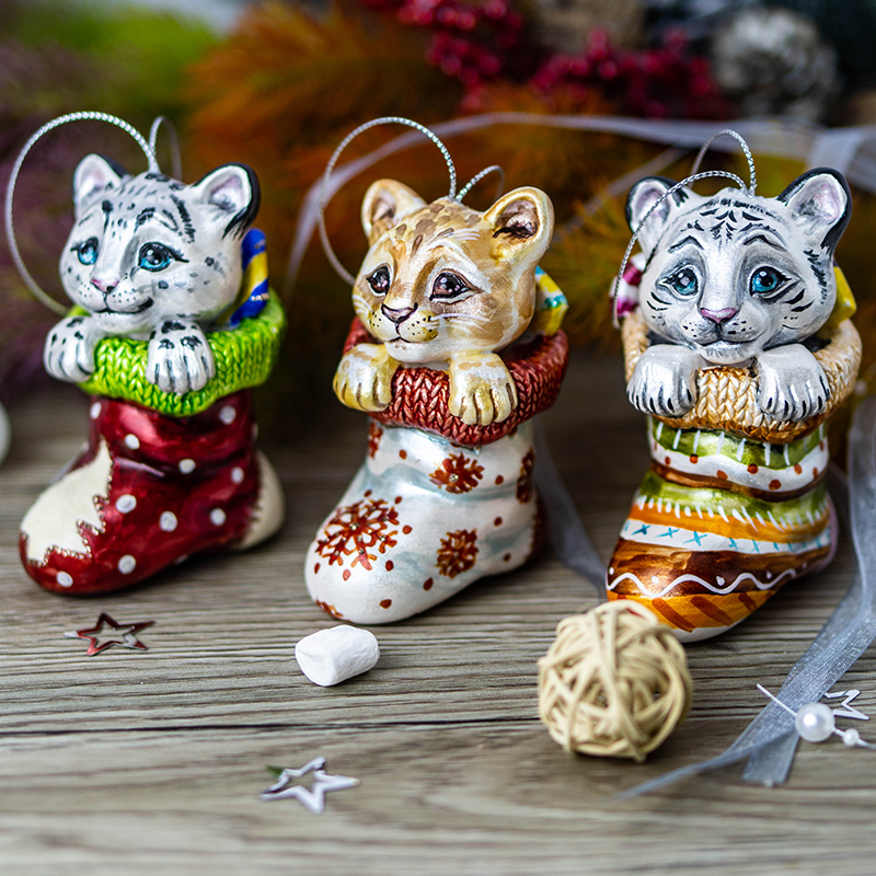 Фарфоровый набор ёлочных игрушек «Дикие котята в носке» от Christmas Art — это трогательная композиция, в которой сочетаются нежность, радость и праздничное волшебство. Очаровательные малыши — тигрята и львята — выглядывают из праздничных рождественских носков, создавая на ёлке атмосферу уюта и доброты.
