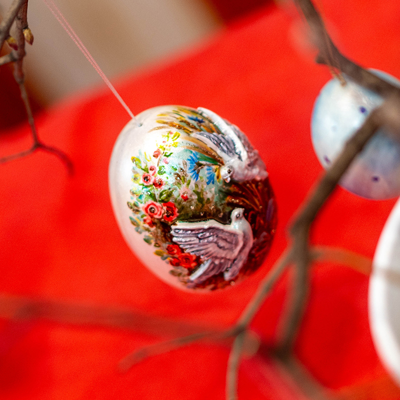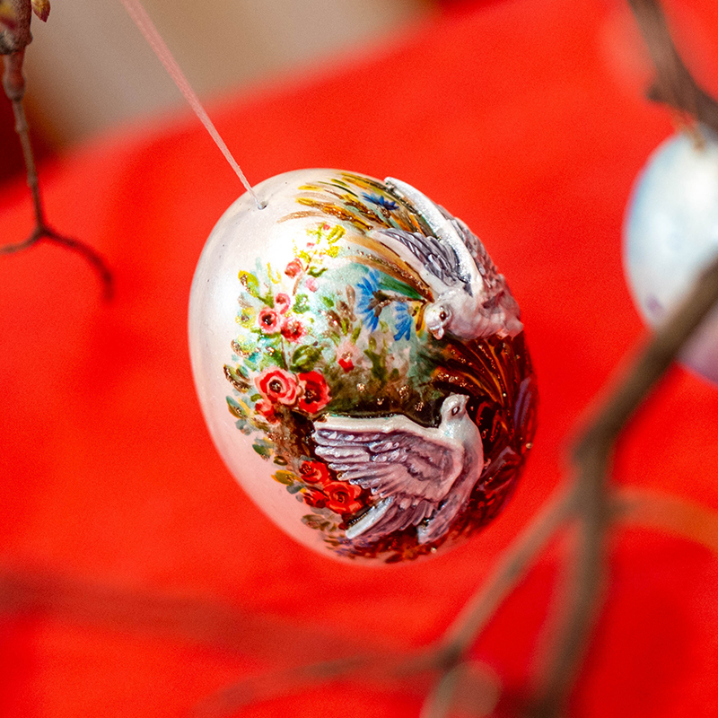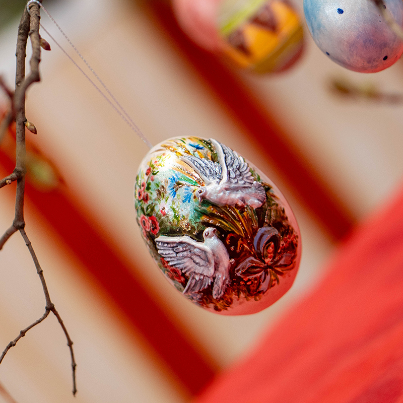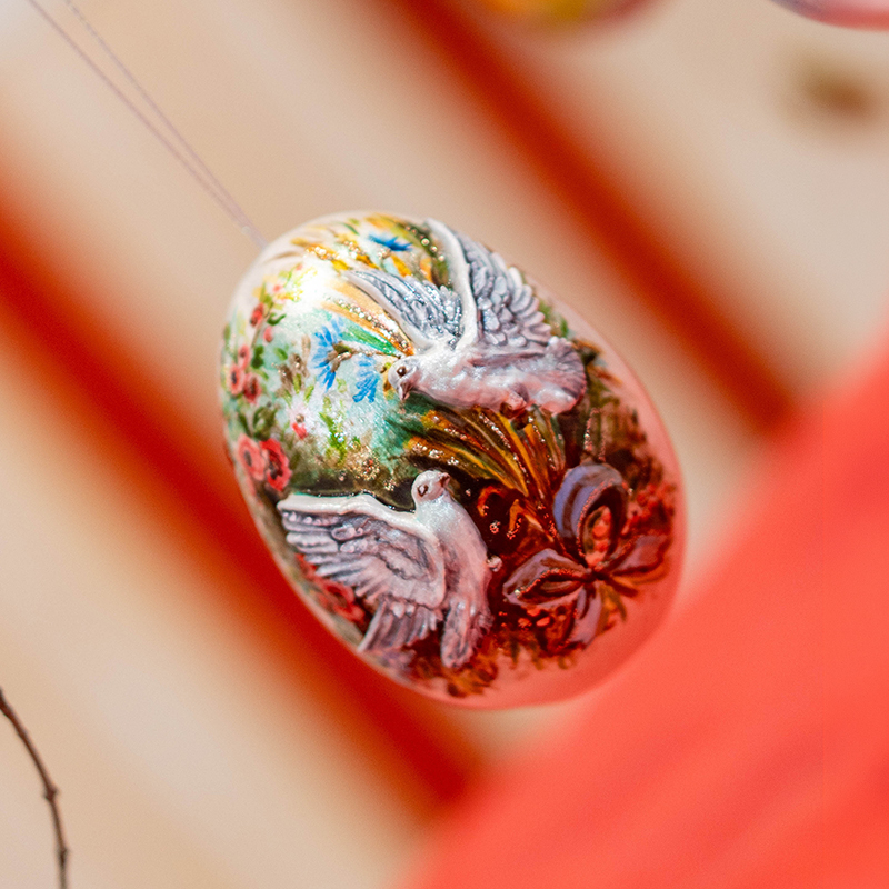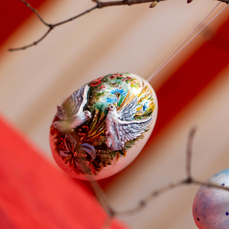 Фарфоровое пасхальное украшение «Яйцо с голубем и горлицей» — это авторский декоративный предмет ручной работы, созданный в традициях праздничного пасхального искусства. Композиция объединяет символы мира, чистоты и обновления — голубя и горлицу, размещённых в изящном орнаментальном оформлении на форме пасхального яйца.
