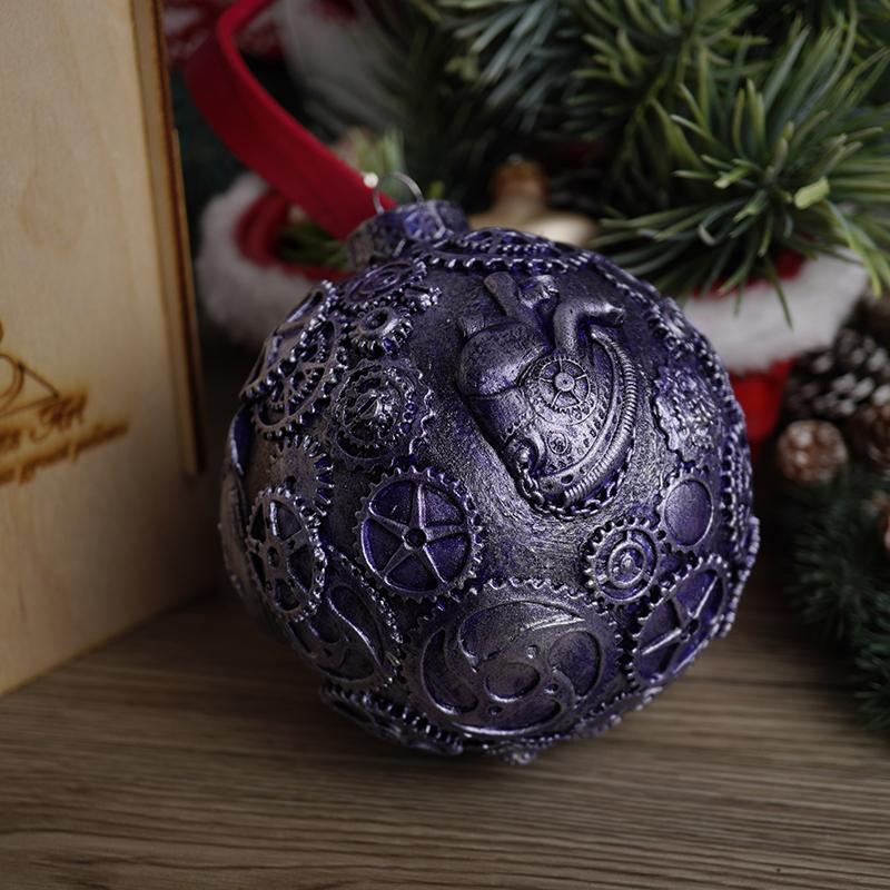 На поверхности шара изображено сердце, выполненное в стиле стимпанк. Его форма украшена механическими элементами — шестерёнками, винтами и декоративными металлическими деталями. Оттенки бронзы, меди и золота создают эффект старинного механизма.