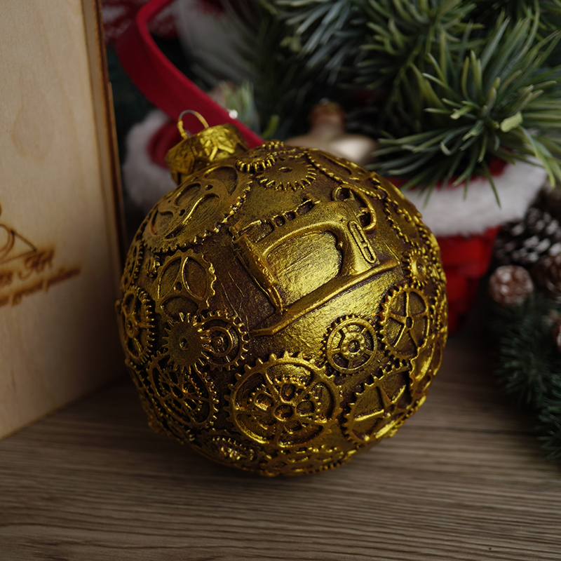 На поверхности шара изображён винтажный велосипед с крупными шестерёнками, механическими элементами и декоративными деталями, выполненными в стиле стимпанк. Металлические оттенки меди, бронзы и золота создают эффект старинного механизма, будто найденного в мастерской талантливого инженера.